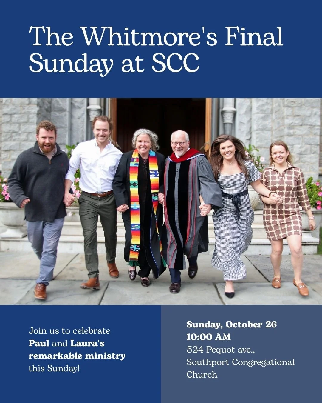 Join us for a meaningful and memorable morning as we celebrate the Whitmore Family on their final Sunday at Southport Congregational Church. Following the service, we invite everyone to a Farewell Fellowship Hour in Fellowship Hall. Come enjoy light refreshments, heartfelt conversation, and the opportunity to say goodbye and thank you to Rev. Paul, Rev. Laura, Scott, Aleigha, Audra, and Parker Whitmore.